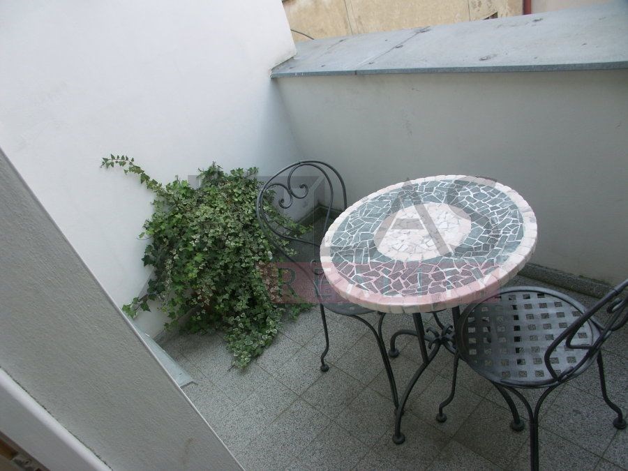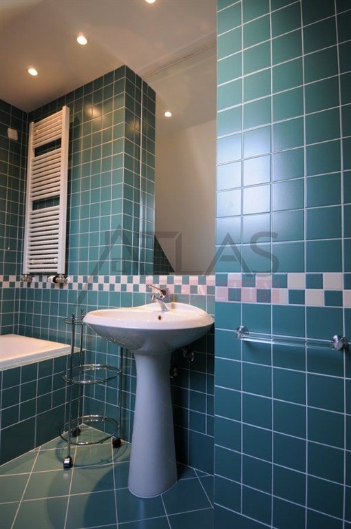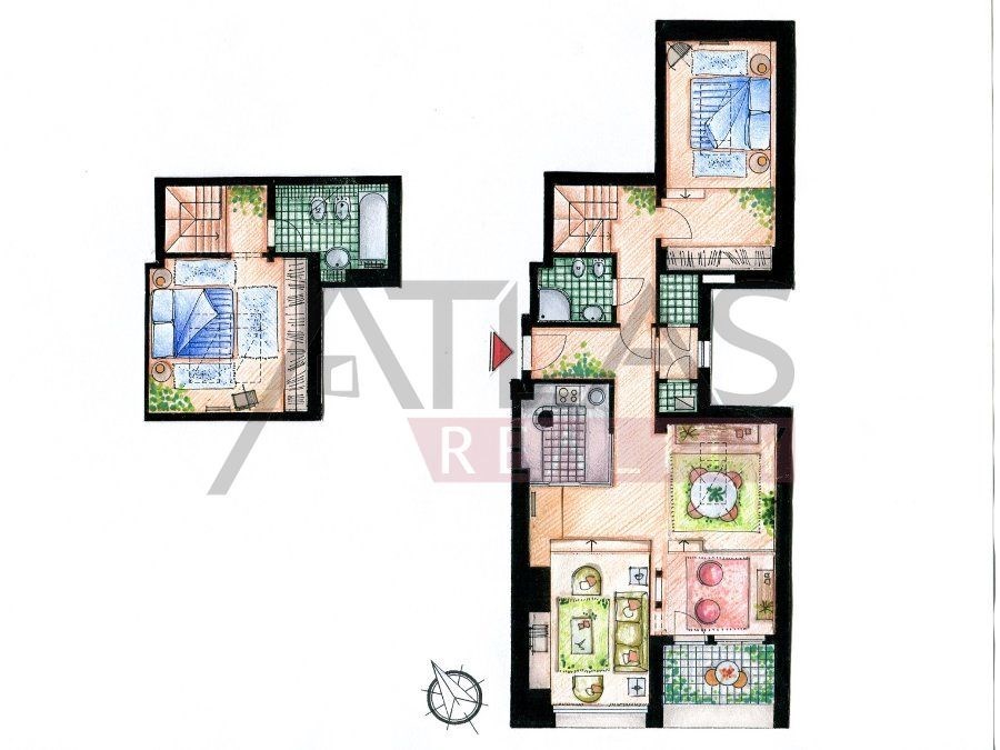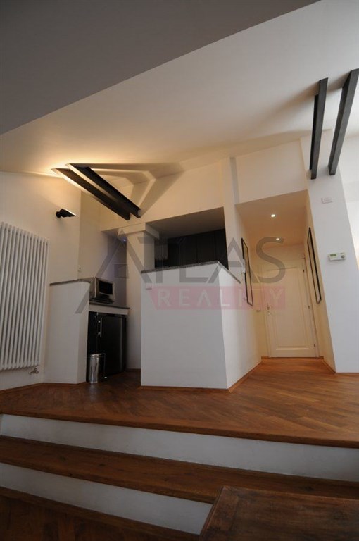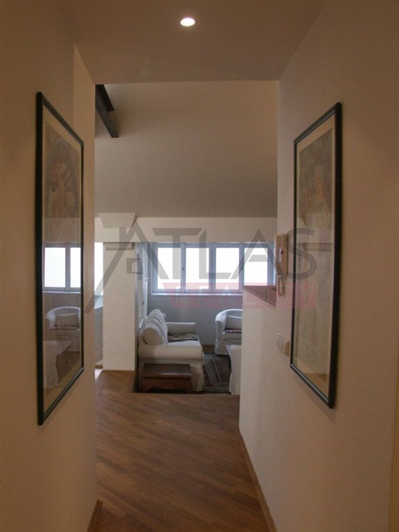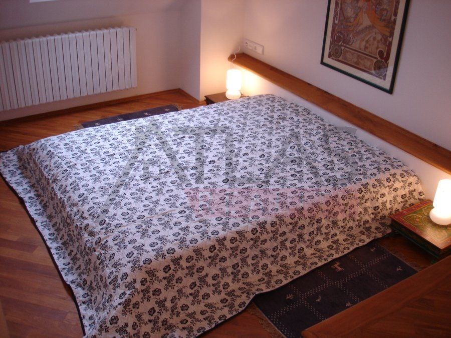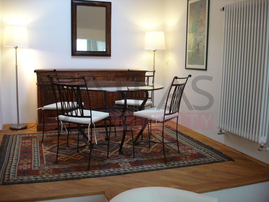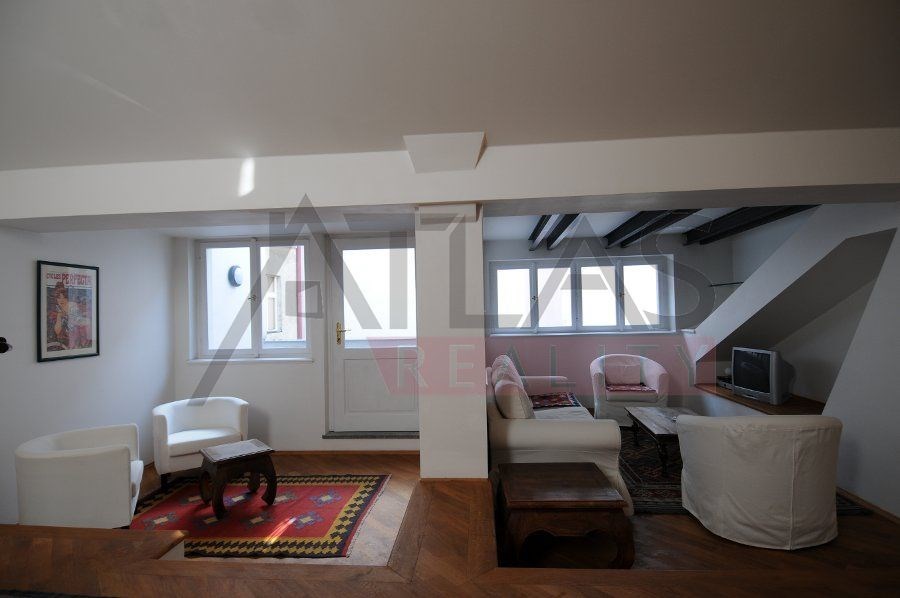 For rent, a two-story attic apartment on the 5th and 6th floors, 96 m2, featuring a magical view of Prague's rooftops and a small balcony with ivy near the living room, original open kitchen facing the living room; impressive fixtures in a luxurious style, oriental carpets (dining room and living room, kitchen, 2 bedrooms, 2 bathrooms, 2 storage rooms). Fully furnished apartment suitable for 4 adults. 1st floor: entrance; living room with dining area, TV, satellite, and DVD; balcony; fully equipped kitchen, bedroom with double bed and built-in wardrobe; bathroom with shower; 2 storage rooms. 2nd floor: hall, bedroom with double bed and built-in wardrobe, bathroom with bathtub.